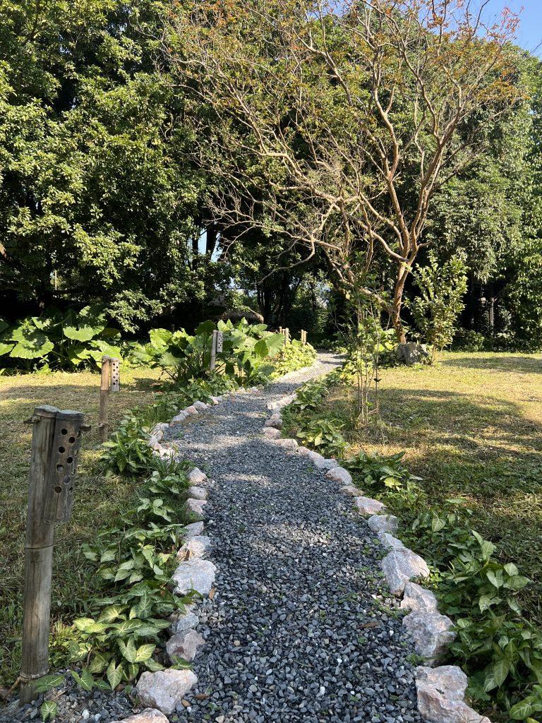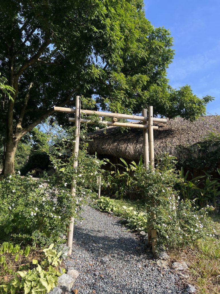 Ngay từ lối vào, Duyên Retreat đã tạo cho mình một cảm giác rất đặc biệt. Anh chủ nhà – cũng chính là kiến trúc sư của khu nghỉ – thiết kế một lối đi nhỏ, hơi tối, khép kín. Và rồi khi bước thêm vài bước, không gian xanh rộng lớn dần mở ra trước mắt.